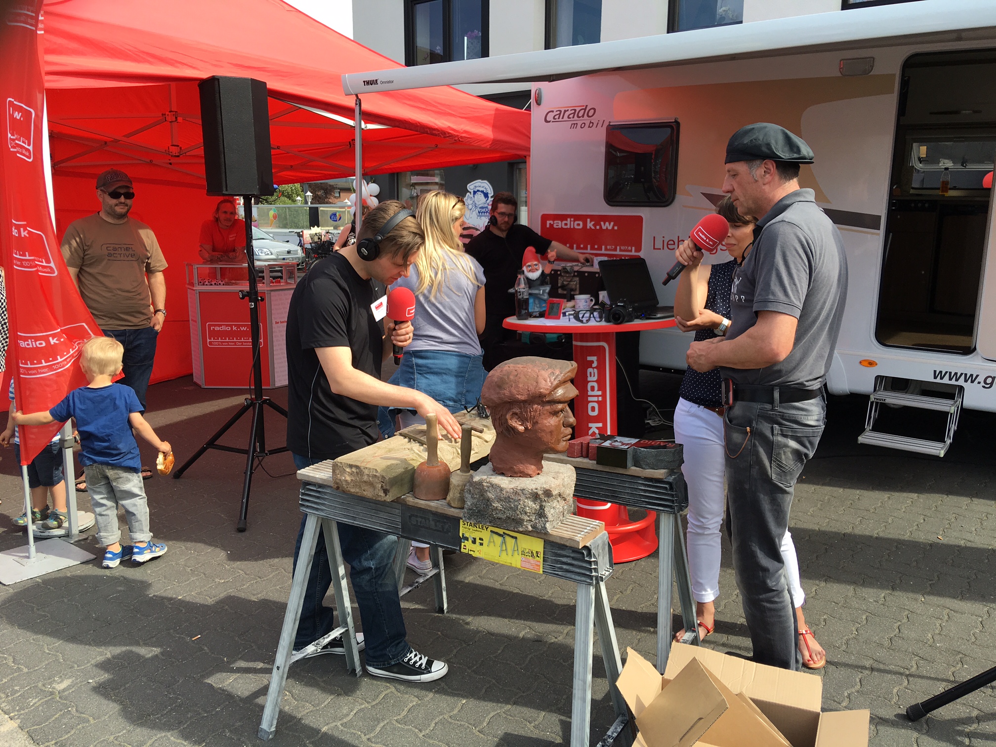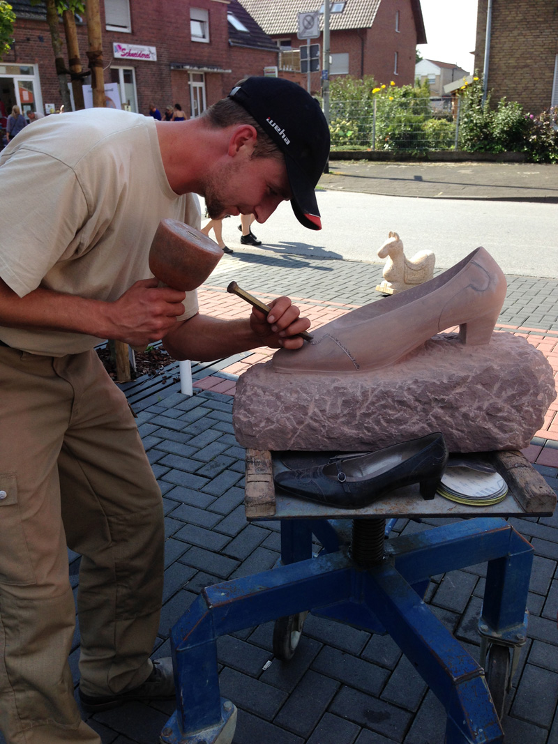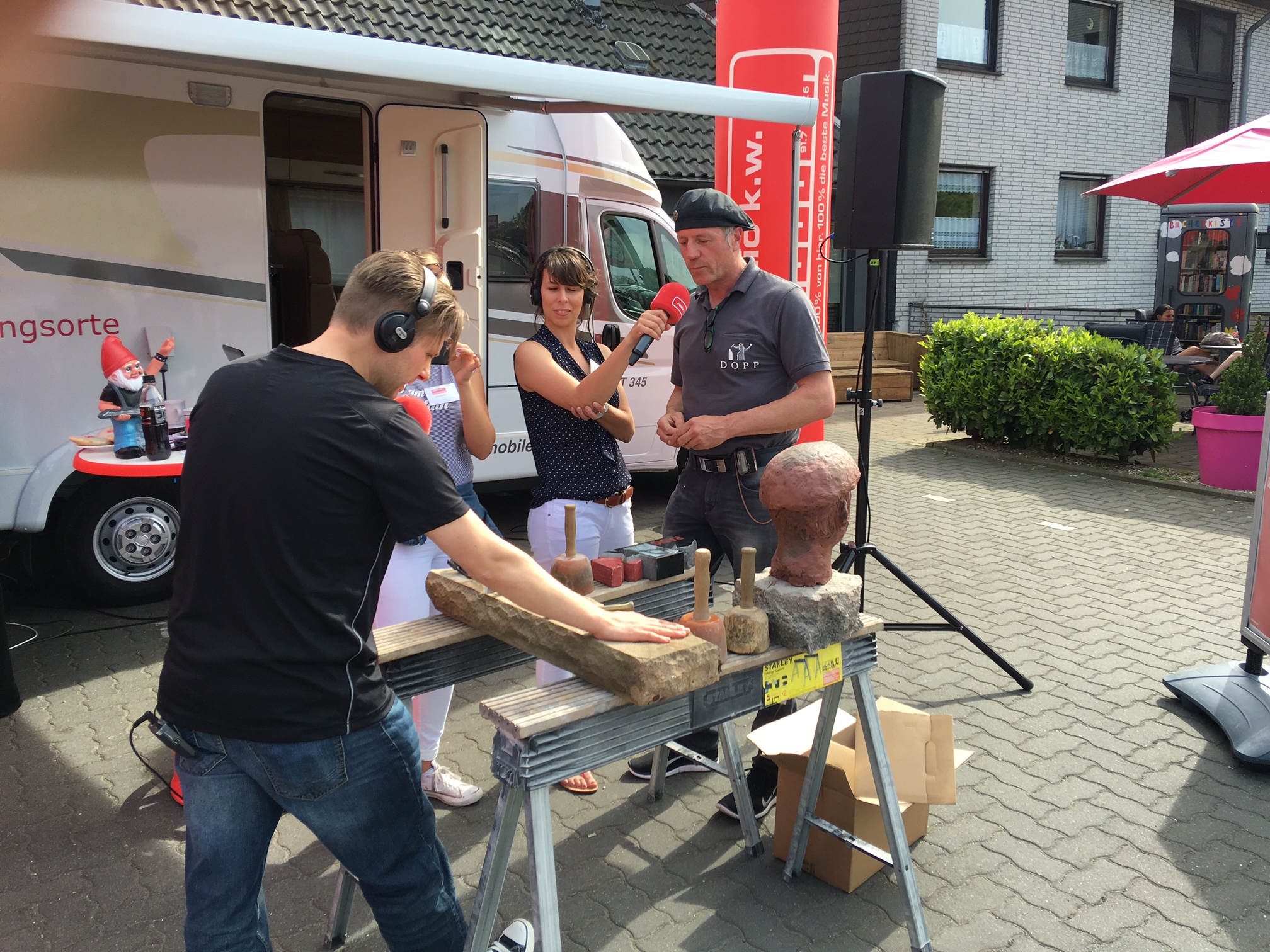 1m großer Sandstein Daumen auf der Maler Palette Eröffnung Olga Landesgartenschau Oberhausen.
